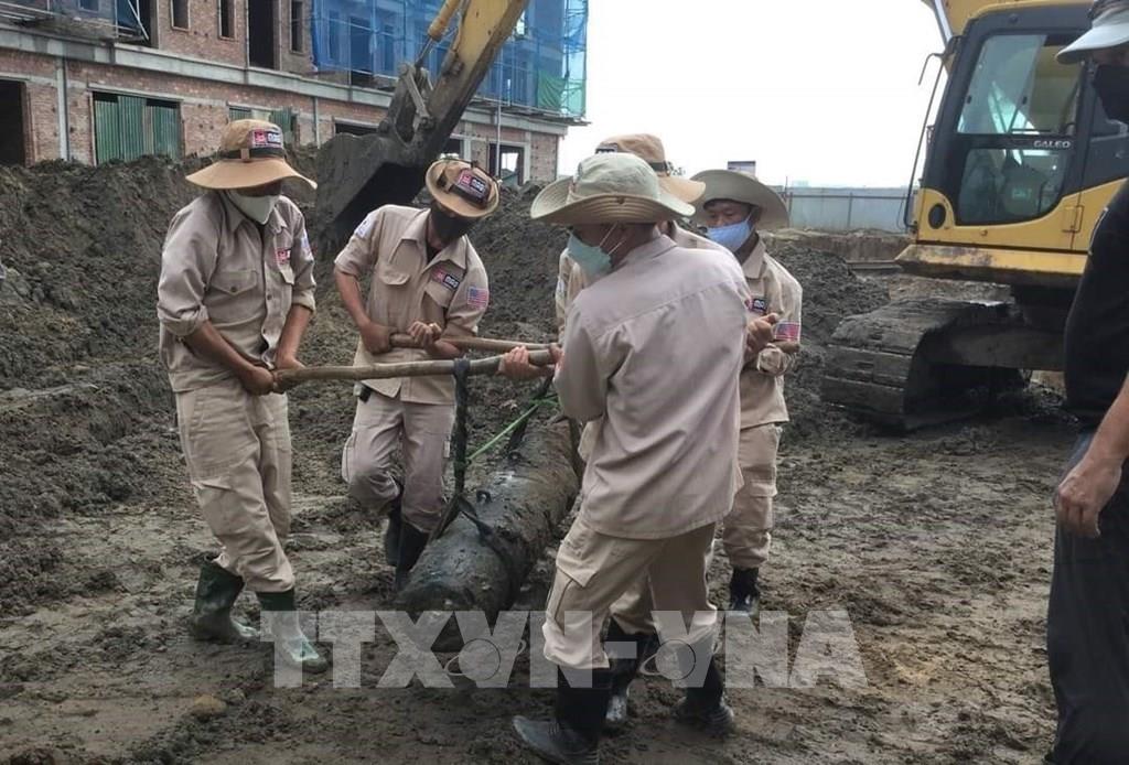 Đội xử lý bom mìn MAG Quảng Bình vận chuyển an toàn quả bom ra khỏi hiện trường. Ảnh: TTXVN