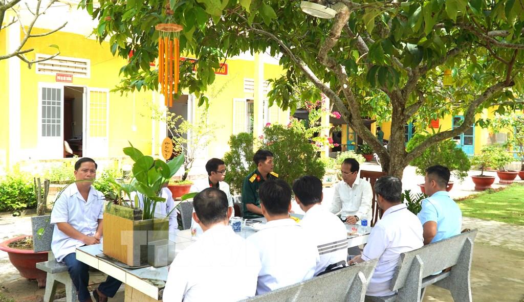 Lãnh đạo Sở Y tế An Giang trao đổi cùng lãnh đạo Trạm Y tế Thổ Châu, Bệnh xá Quân Dân Y và lãnh đạo đặc khu Thổ Châu về tình hình khám, chữa bệnh cán bộ, chiến sĩ và nhân dân. Ảnh: Văn Sĩ - TTXVN