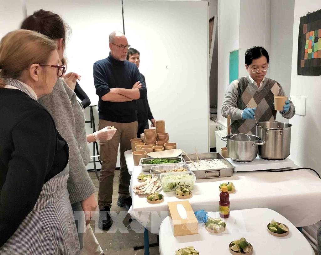 Cán bộ Thương vụ Việt Nam tại Bỉ giới thiệu món phở gà. Ảnh: Hương Giang - PV TTXVN tại Bỉ