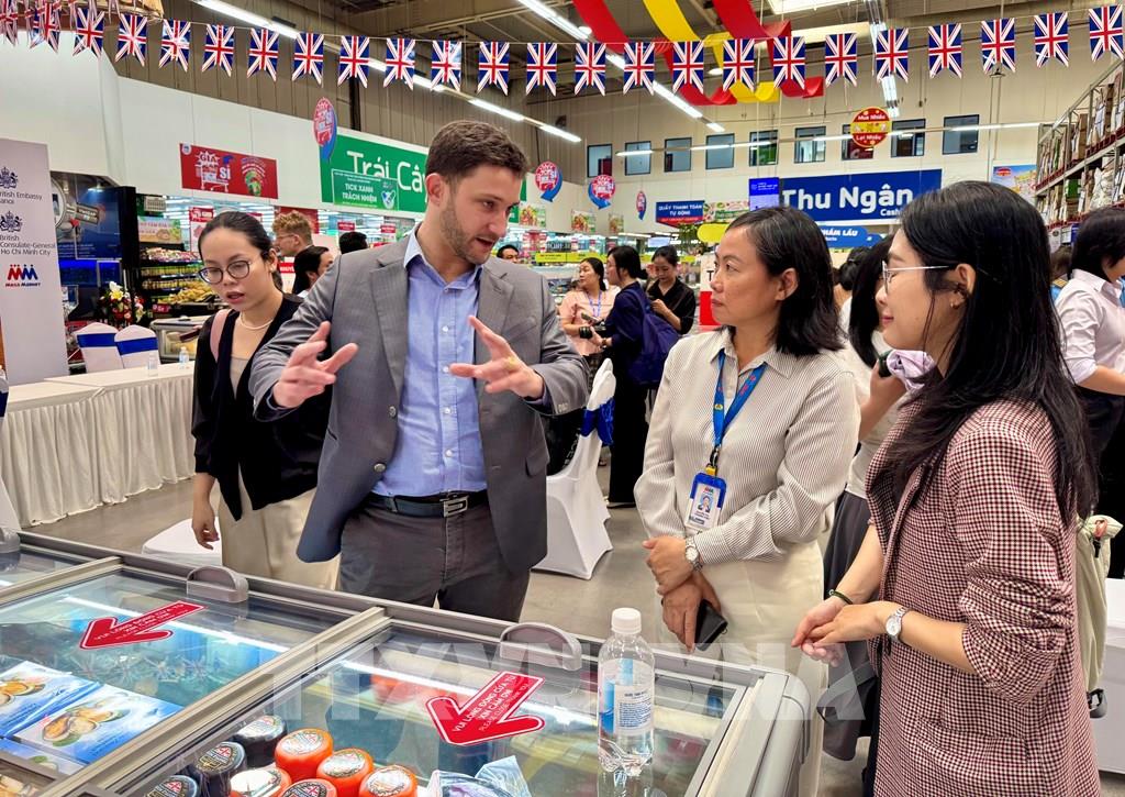 Đại diện nhà sản xuất thực phẩm Anh giới thiệu sản phẩm đến người tiêu dùng Việt Nam. Ảnh: Hương Giang - TTXVN