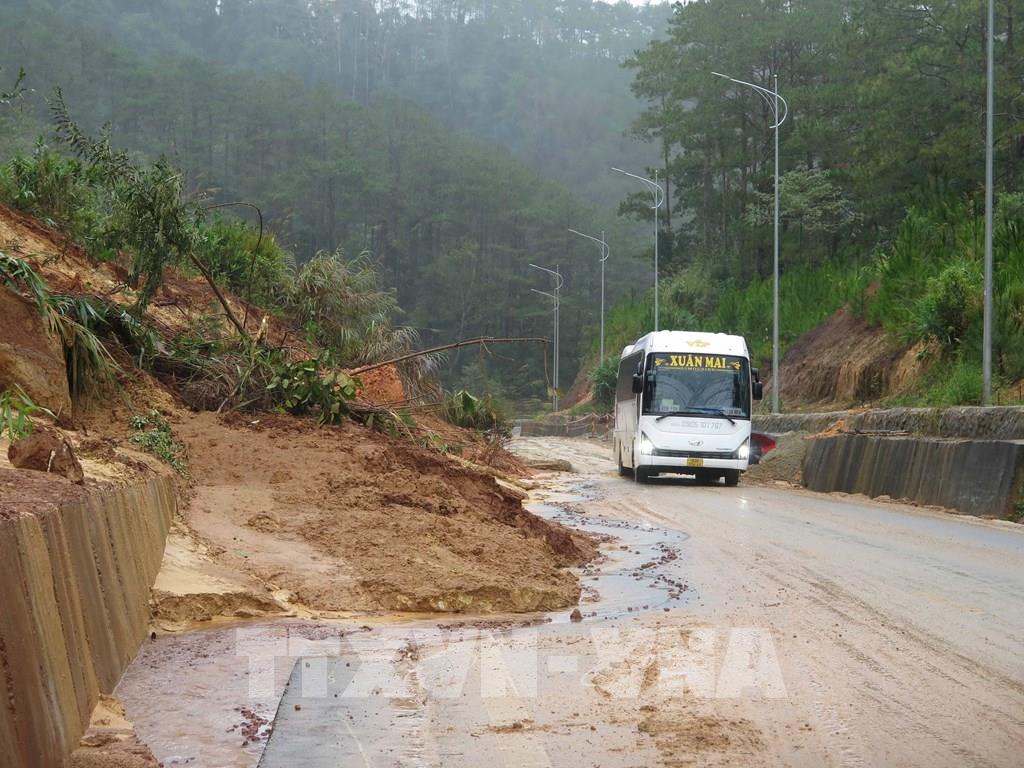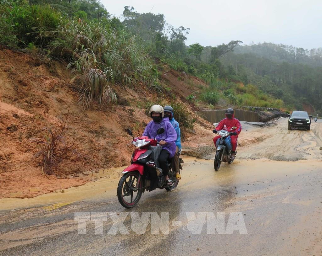 Hàng chục điểm sạt lở trên tuyến Quốc lộ 24 gây nguy hiểm cho các phương tiện giao thông. Ảnh: Dư Toán - TTXVN