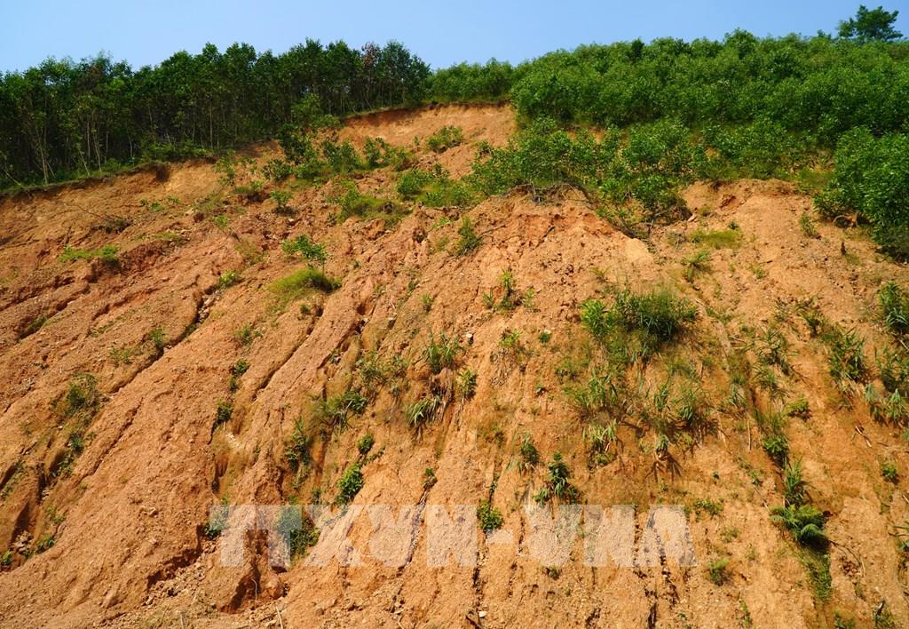 Khu vực sạt lở dọc tuyến đường ĐH74 (Quảng Ngãi) hình thành nhiều hốc sâu và vết nứt kéo dài. Ảnh: Lê Phước Ngọc-TTXVN