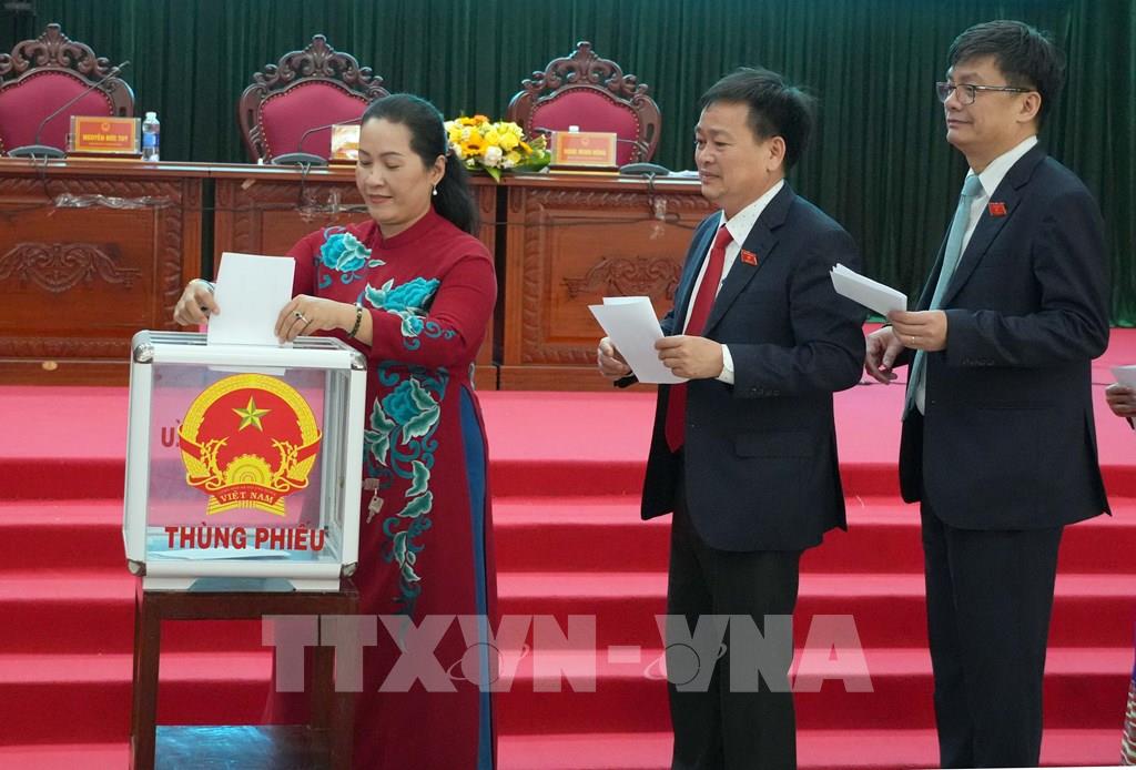 Các đại biểu bỏ phiếu bầu bổ sung Ủy viên UBND tỉnh nhiệm kỳ 2021 - 2026 đối với ông Nguyễn Văn Trọng, Giám đốc Sở Tài chính tỉnh Quảng Ngãi. Ảnh: Dư Toán - TTXVN