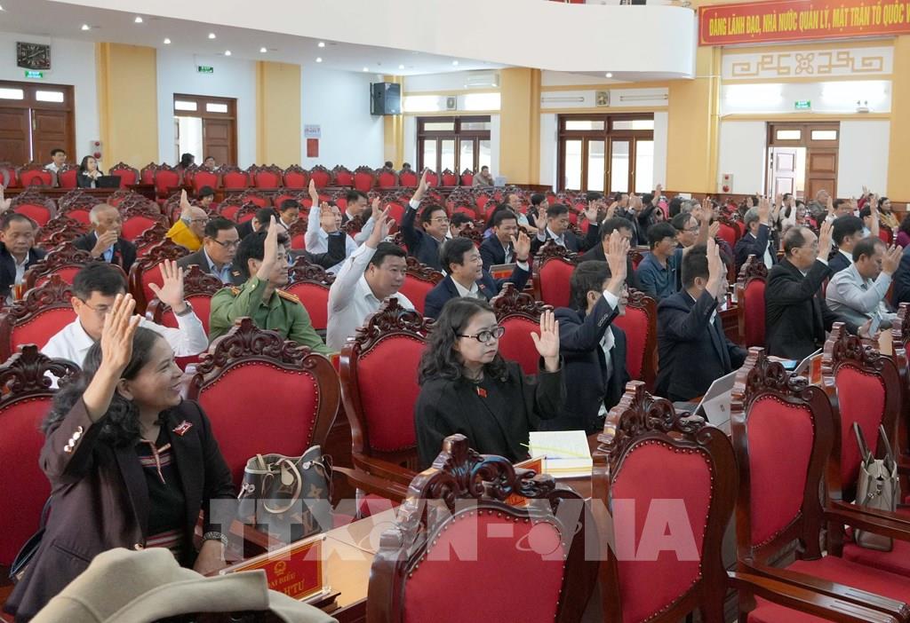Các đại biểu biểu quyết thông qua Nghị quyết điều chỉnh Quy hoạch tỉnh Quảng Ngãi thời kỳ 2021 - 2030, tầm nhìn đến năm 2050. Ảnh: Dư Toán - TTXVN