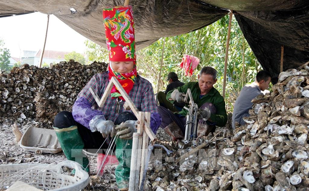 Tái sử dụng vỏ hàu làm giá thể tạo nguồn hàu mới ở xã Đầm Hà (Quảng Ninh). Ảnh: Văn Đức - TTXVN