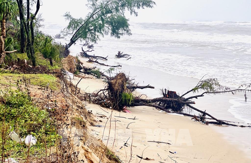 Bờ biển phường Bắc Gianh bị sạt lở nghiêm trọng, uy hiếp trực tiếp tuyến đường ven biển và tuyến đường dân sinh. Ảnh: Nguyên Linh - TTXVN