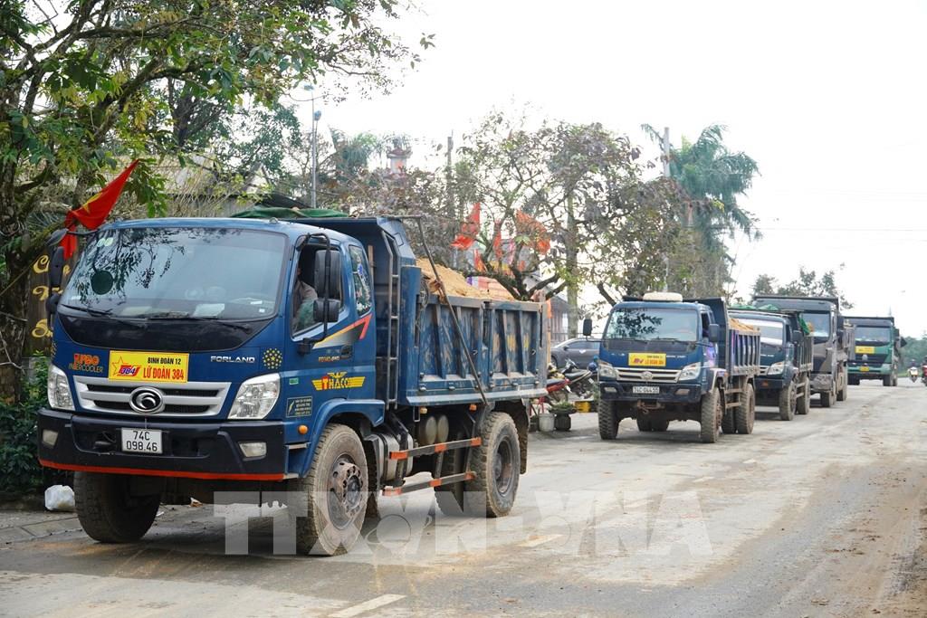 Phương tiện vận chuyển vật liệu thi công công trình khẩn cấp, chống sụt trượt tại khu dân cư đường Hùng Vương, xã Khe Sanh (Quảng Trị). Ảnh: TTXVN phát