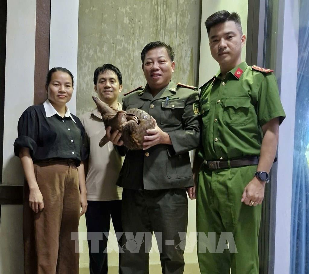Các lực lượng chức năng tiếp nhận cá thể tê tê thuộc nhóm IB nguy cấp, quý hiếm từ người dân. Ảnh: TTXVN phát
