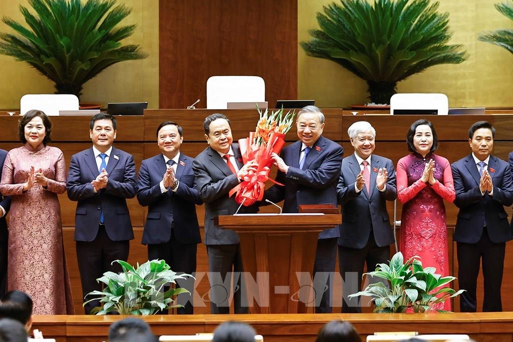 Tổng Bí thư Tô Lâm thay mặt các đại biểu Quốc hội khóa XVI tặng hoa chúc mừng Chủ tịch Quốc hội Trần Thanh Mẫn, các Phó Chủ tịch Quốc hội và Ủy viên Ủy ban Thường vụ Quốc hội. Ảnh: Doãn Tấn - TTXVN