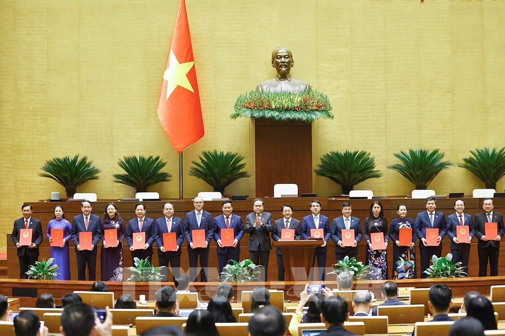 (i) Bầu Phó Chủ tịch Quốc hội và Ủy viên Ủy ban Thường vụ Quốc hội khóa XVI bằng hình thức bỏ phiếu kín. Ban kiểm phiếu làm việc và báo cáo Quốc hội kết quả kiểm phiếu. (ii) Nghe Ủy viên Ủy ban Thường vụ Quốc hội khóa XV Lê Quang Mạnh, thay mặt Ủy ban Thường vụ Quốc hội khóa XV trình bày 2 dự thảo Nghị quyết bầu Phó Chủ tịch Quốc hội khóa XVI và Ủy viên Ủy ban Thường vụ Quốc hội khóa XVI. Sau đó, Quốc hội thảo luận, biểu quyết thông qua các dự thảo Nghị quyết nêu trên bằng hệ thống biểu quyết điện tử. Kết quả như sau: (1) Đối với Nghị quyết bầu Phó Chủ tịch Quốc hội khóa XVI, có 496 đại biểu tham gia biểu quyết, trong đó có 496 đại biểu tán thành (bằng 100% đại biểu Quốc hội có mặt và bằng 99,20% tổng số đại biểu Quốc hội). Theo đó, danh sách các Phó Chủ tịch Quốc hội khóa XVI gồm các ông/bà có tên sau: Ông Đỗ Văn Chiến; Ông Nguyễn Khắc Định; Bà Nguyễn Thị Thanh; Ông Nguyễn Hồng Diên; Ông Nguyễn Doãn Anh; Bà Nguyễn Thị Hồng. (2) Đối với Nghị quyết bầu Ủy viên Ủy ban Thường vụ Quốc hội khóa XVI, có 487 đại biểu tham gia biểu quyết, trong đó có 487 đại biểu tán thành (bằng 100% đại biểu Quốc hội có mặt và bằng 97,40% tổng số đại biểu Quốc hội). (iii) Nghe Ủy viên Ủy ban Thường vụ Quốc hội Nguyễn Hữu Đông, thay mặt Ủy ban Thường vụ Quốc hội trình bày các Nghị quyết về việc phê chuẩn Trưởng Đoàn đại biểu Quốc hội khóa XVI. Sau đó, Chủ tịch Quốc hội Trần Thanh Mẫn trao Nghị quyết cho các Trưởng Đoàn đại biểu Quốc hội khóa XVI. (iv) Nghe Ủy viên Ủy ban Thường vụ Quốc hội Nguyễn Hữu Đông thay mặt Ủy ban Thường vụ Quốc hội trình bày 3 Tờ trình về nhân sự bầu Chủ tịch Hội đồng Dân tộc, Chủ nhiệm Ủy ban của Quốc hội khóa XVI; Tổng Thư ký Quốc hội khóa XVI - Chủ nhiệm Văn phòng Quốc hội; Tổng Kiểm toán nhà nước nhiệm kỳ 2026 - 2031. Sau đó, Quốc hội thảo luận, biểu quyết thông qua dự thảo các Nghị quyết để bầu các chức danh nêu trên bằng hệ thống biểu quyết điện tử. Kết quả như sau: có 493 đại biểu tham gia biểu quyết, trong đó có 493 đại biểu tán thành (bằng 100% đại biểu Quốc hội có mặt và bằng 98.60% tổng số đại biểu Quốc hội). Tiếp đó, Quốc hội bầu các chức danh Chủ tịch Hội đồng Dân tộc, Chủ nhiệm Ủy ban của Quốc hội khóa XVI, Tổng Thư ký Quốc hội khóa XVI - Chủ nhiệm Văn phòng Quốc hội, Tổng Kiểm toán nhà nước nhiệm kỳ 2026 - 2031 bằng hình thức bỏ phiếu kín. Quốc hội nghe Ban kiểm phiếu báo cáo kết quả kiểm phiếu. (v) Nghe Ủy viên Ủy ban Thường vụ Quốc hội Lê Quang Mạnh, thay mặt Ủy ban Thường vụ Quốc hội trình bày 3 dự thảo Nghị quyết bầu Chủ tịch Hội đồng Dân tộc, Chủ nhiệm Ủy ban của Quốc hội khóa XVI; Tổng Thư ký Quốc hội khóa XVI - Chủ nhiệm Văn phòng Quốc hội; Tổng Kiểm toán nhà nước nhiệm kỳ 2026 - 2031. Sau đó, Quốc hội thảo luận, biểu quyết thông qua dự thảo các Nghị quyết bầu các chức danh nêu trên bằng hệ thống biểu quyết điện tử. Kết quả như sau: - Đối với Nghị quyết bầu Chủ tịch Hội đồng Dân tộc, Chủ nhiệm Ủy ban của Quốc hội khóa XVI, có 493 đại biểu tham gia biểu quyết, trong đó có 493 đại biểu tán thành (bằng 100% đại biểu Quốc hội có mặt và bằng 98,60% tổng số đại biểu Quốc hội). Theo đó, danh sách Chủ tịch Hội đồng Dân tộc, Chủ nhiệm Ủy ban của Quốc hội khóa XVI gồm các ông/bà có tên sau: Ông Lâm Văn Mẫn, Chủ tịch Hội đồng Dân tộc của Quốc hội; Ông Phan Chí Hiếu, Chủ nhiệm Ủy ban Pháp luật và Tư pháp của Quốc hội; Ông Phan Văn Mãi, Chủ nhiệm Ủy ban Kinh tế và Tài chính của Quốc hội; Ông Lê Tấn Tới, Chủ nhiệm Ủy ban Quốc phòng, An ninh và Đối ngoại của Quốc hội; Ông Nguyễn Đắc Vinh, Chủ nhiệm Ủy ban Văn hóa và Xã hội của Quốc hội; Bà Nguyễn Thanh Hải, Chủ nhiệm Ủy ban Khoa học, Công nghệ và Môi trường của Quốc hội; Ông Nguyễn Hữu Đông, Chủ nhiệm Ủy ban Công tác đại biểu của Quốc hội; Bà Lê Thị Nga, Chủ nhiệm Ủy ban Dân nguyện và Giám sát của Quốc hội.- Đối với Nghị quyết bầu Tổng Thư ký Quốc hội khóa XVI - Chủ nhiệm Văn phòng Quốc hội, có 481 đại biểu tham gia biểu quyết, trong đó có 481 đại biểu tán thành (bằng 100% đại biểu Quốc hội có mặt và bằng 96,20% tổng số đại biểu Quốc hội). Theo đó, ông Lê Quang Mạnh được bầu giữ chức Tổng Thư ký Quốc hội khóa XVI - Chủ nhiệm Văn phòng Quốc hội.