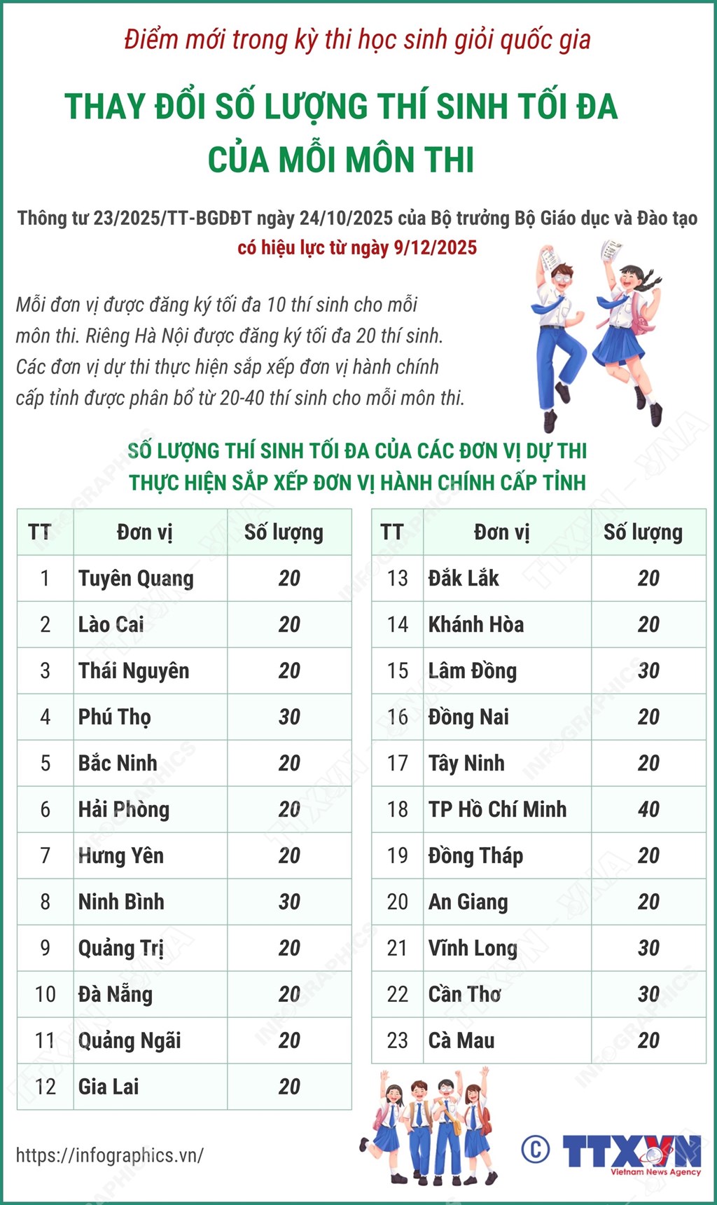 Theo đó, về số lượng thí sinh dự thi, Thông tư quy định mỗi đơn vị dự thi được đăng ký tối đa 10 thí sinh cho đội tuyển mỗi môn thi.