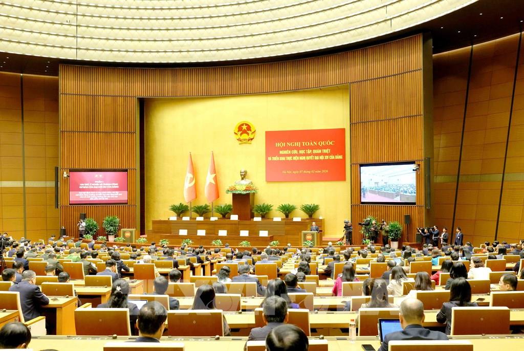 Hội nghị toàn quốc nghiên cứu, học tập, quán triệt và triển khai thực hiện Nghị quyết Đại hội XIV của Đảng tại điểm cầu chính Hội trường Diên Hồng, Nhà Quốc hội. Ảnh: Phương Hoa - TTXVN