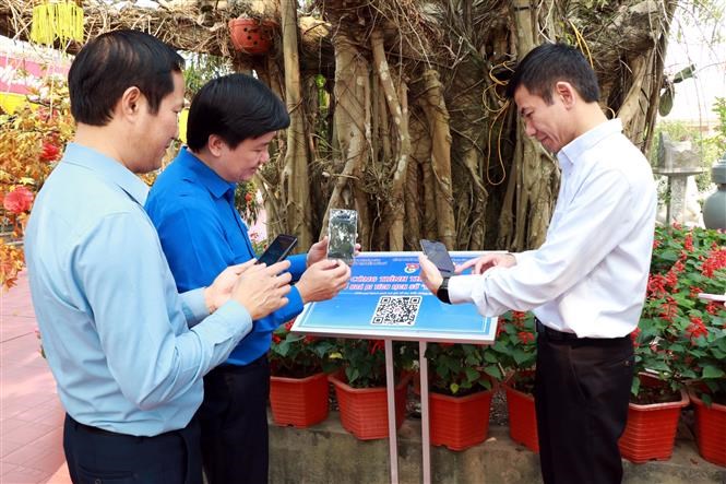 Các đại biểu quét mã QR số hóa di tích Đền Cây Quế, phường Thiên Trường (tỉnh Ninh Bình). Ảnh: Nguyễn Lành - TTXVN