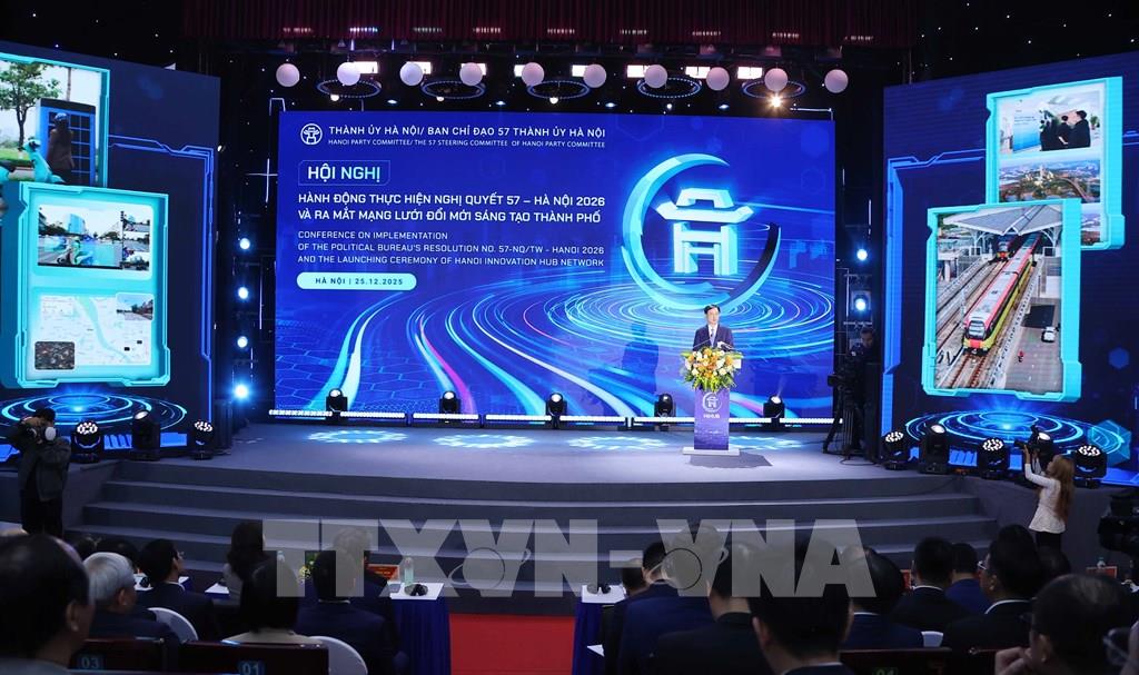 Bí thư Thành ủy Hà Nội Nguyễn Duy Ngọc phát biểu tại Hội nghị hành động thực hiện Nghị quyết 57 - Hà Nội 2026 và ra mắt Mạng lưới đổi mới sáng tạo Hà Nội. Ảnh: Văn Điệp – TTXVN