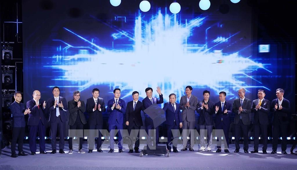 Bí thư Thành ủy Hà Nội Nguyễn Duy Ngọc và đại biểu thực hiện nghi thức ra mắt Mạng lưới đổi mới sáng tạo Hà Nội. Ảnh: Văn Điệp – TTXVN
