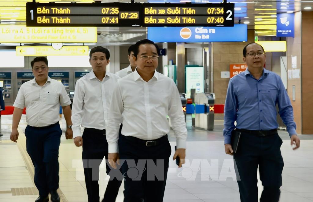 Chủ tịch UBND Thành phố Hồ Chí Minh Nguyễn Văn Được cùng lãnh đạo các sở, ngành di chuyển lên Metro số 1 đến Trung tâm Phục vụ hành chính công thành phố. Ảnh: Xuân Anh - TTXVN