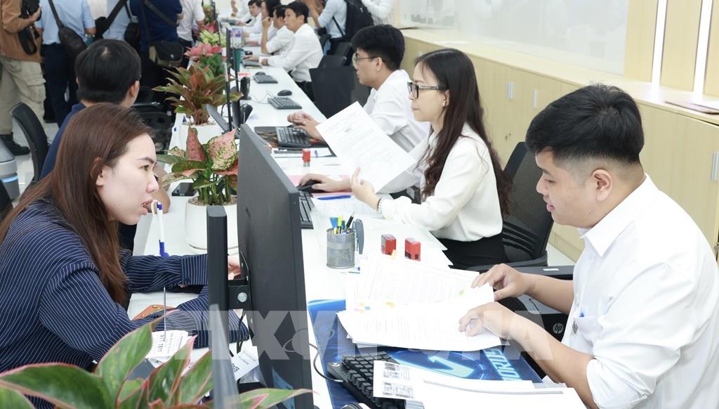 Chuyên viên tiếp nhận hồ sơ của người dân, doanh nghiệp tại Trung tâm Phục vụ hành chính công Thành phố Hồ Chí Minh. Ảnh: Xuân Anh – TTXVN