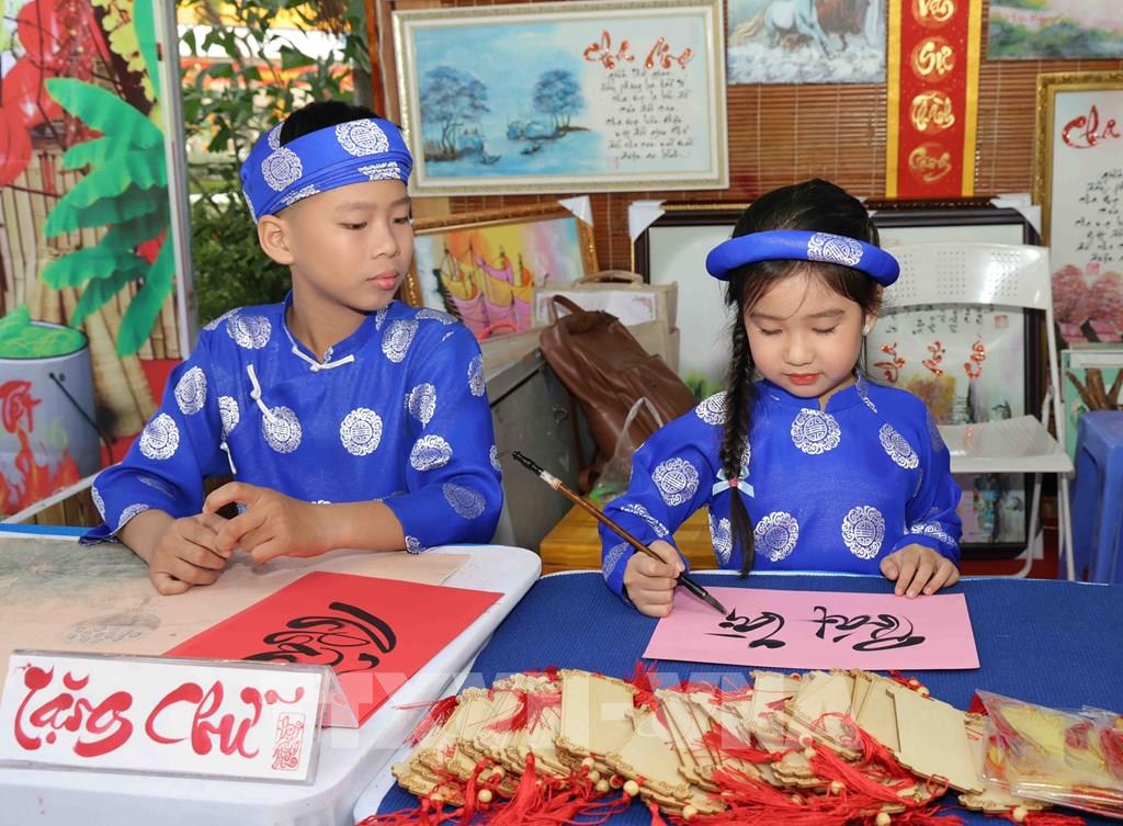 Các "ông đồ", "bà đồ" nhí cho chữ tại Phố Ông Đồ. Ảnh: TTXVN phát