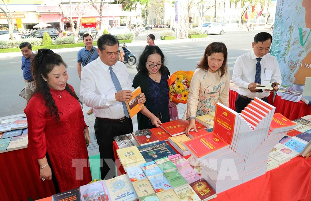 Lãnh đạo UBND thành phố Cần Thơ xem các ấn phẩm sách báo được trưng bày tại Công viên Sách Xuân. Ảnh: TTXVN phát
