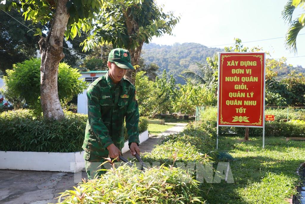 Chiến sĩ Đồn Biên phòng Hòn Khoai chăm sóc, trang trí cây cảnh chuẩn bị đón Tết. Ảnh: Huỳnh Anh - TTXVN