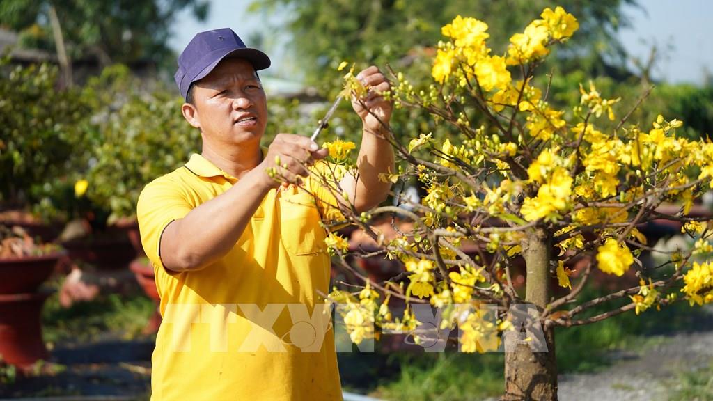 Nghệ nhân Trần Hữu Thiết (phường Tân An, tỉnh Tây Ninh) tạo dáng mai vàng phục vụ thị trường Tết. Ảnh: Minh Phú - TTXVN