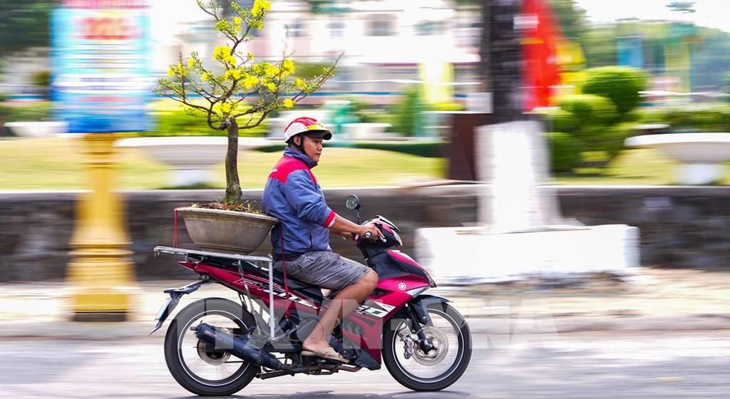 Người dân hối hả chở hoa trên đường phố, sắc xuân lan tỏa khắp các tuyến đường. Ảnh: Minh Phú - TTXVN