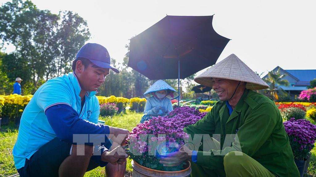 Nông dân trồng hoa xã Hảo Đước tất bật hoàn thành các công đoạn cuối để đưa hoa ra chợ phục vụ thị trường Tết. Ảnh: Minh Phú – TTXVN
