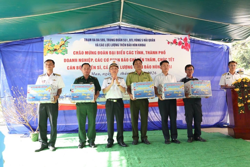 Tiếp tục hải trình của Đoàn công tác các tỉnh, thành phố, các doanh nghiệp và cơ quan thông tấn báo chí đến thăm, chúc Tết cán bộ, chiến sĩ, các lực lượng và nhân dân trên các đảo thuộc vùng biển Tây Nam nhân dịp Tết Nguyên đán Bính Ngọ 2026, chiều 11/1, Đoàn công tác đã tới thăm và chúc Tết cán bộ, chiến sĩ và các lực lượng trên đảo Hòn Khoai (tỉnh Cà Mau).