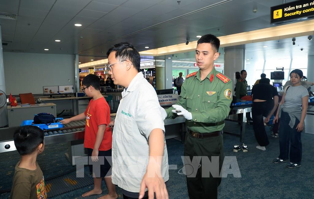 Lực lượng an ninh hàng không kiểm tra hành khách trước khi vào khu vực chờ ra cửa lên máy bay. Ảnh: Quốc Khánh - TTXVN
