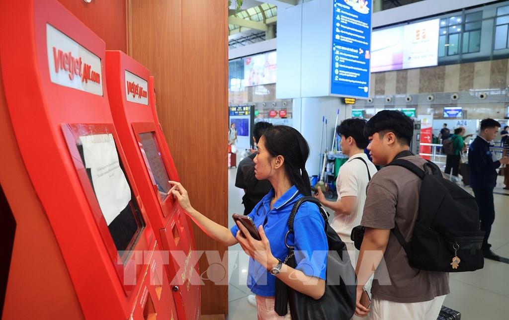 Người dân làm thủ tục "check-in" tại quầy làm thủ tục tự động của hãng hàng không VietJet Air, nhà ga T1 cảng hàng không quốc tế Nội Bài. Ảnh: Quốc Khánh - TTXVN