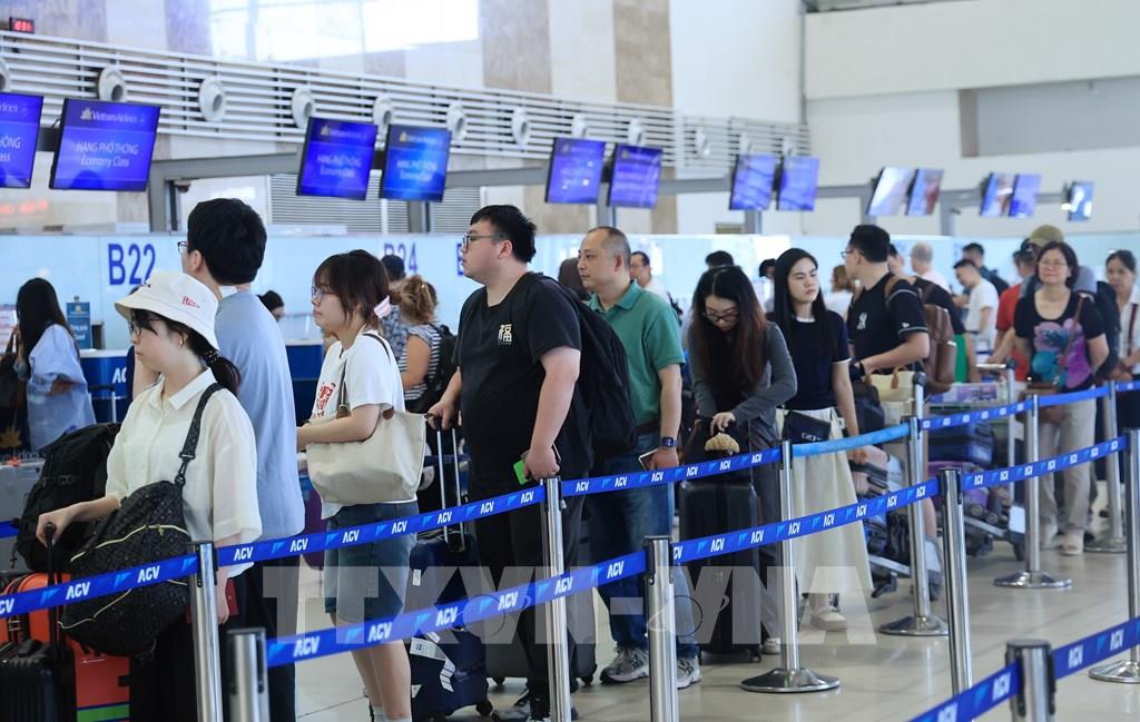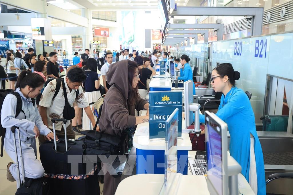 Do sân bay đang áp dụng kiểm soát an ninh hàng không cấp độ 1, hành khách được khuyến cáo đến sớm từ 2 - 3 tiếng để tránh nguy cơ chậm chuyến. Ảnh: Quốc Khánh - TTXVN m từ 2 - 3 tiếng để tránh nguy cơ chậm chuyến. Ảnh: Quốc Khánh - TTXVN