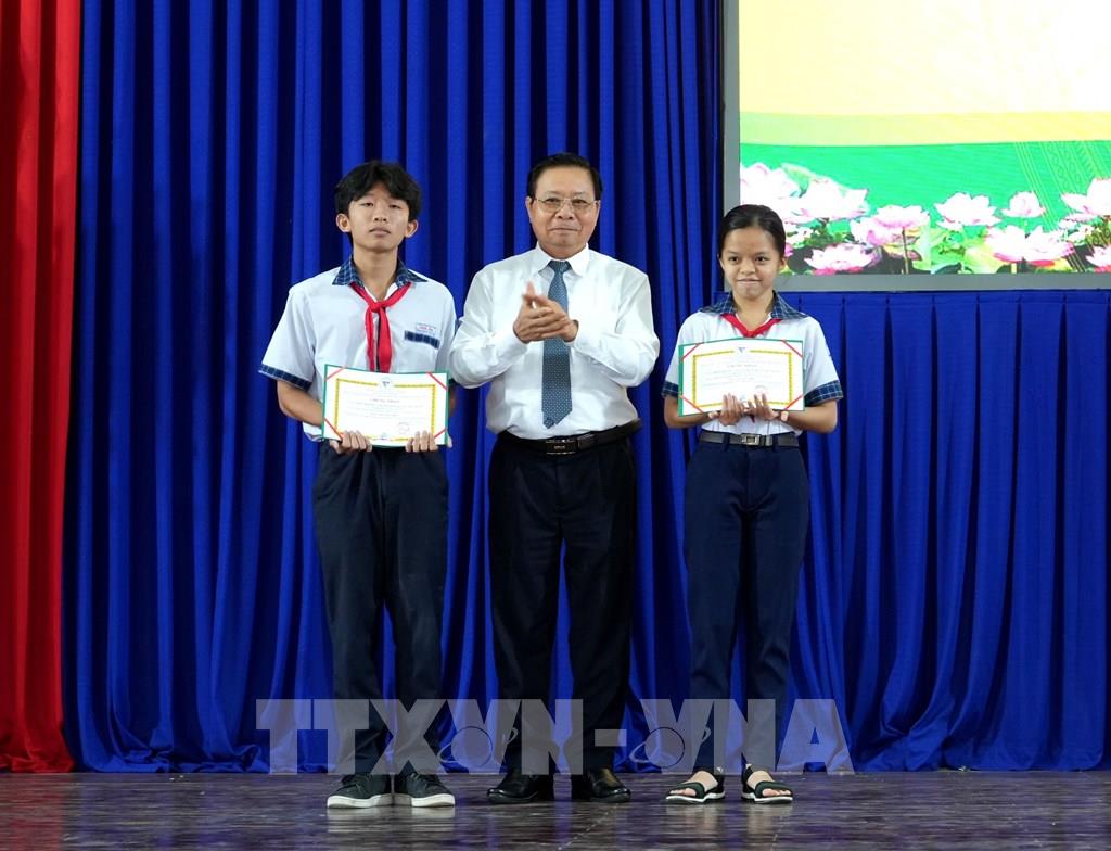 Trao giải cho tác giả, nhóm tác giả đạt giải Nhất Cuộc thi Sáng tạo Thanh thiếu niên, nhi đồng tỉnh Vĩnh Long lần thứ 14. Ảnh: Lê Thúy Hằng – TTXVN