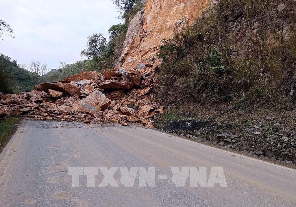 Khối lượng đất đá rất lớn vùi lấp, gây ách tắc tuyến đường tại Km124+300, đèo Thung Khe (Quốc lộ 6). Ảnh: TTXVN
