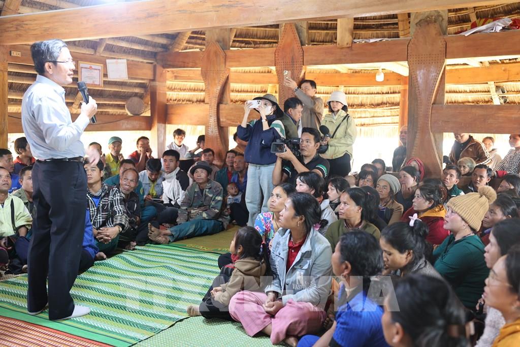 Ông Trần Nam Hưng, Phó Chủ tịch UBND thành phố Đà Nẵng đã thăm hỏi, động viên bà con được di dời về nhà sinh hoạt cộng đồng tránh trú do ảnh hưởng của sạt lở núi. Ảnh: Anh Dũng – TTXVN