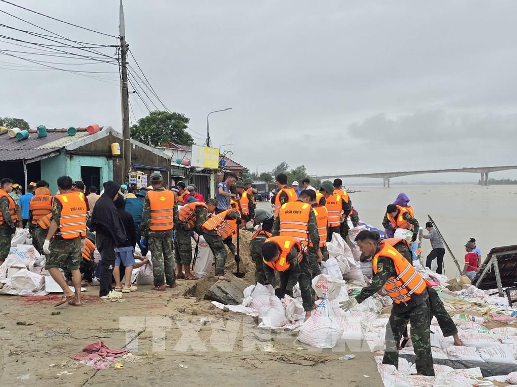 Lực lượng quân đội và người dân góp sức khắc phục sạt lở bờ kè tại xã An Lương (thành phố Đà Nẵng). Ảnh: Khoa Chương - TTXVN