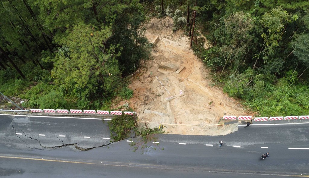 Đoạn sạt lở trên đèo Prenn (cửa ngõ lên Đà Lạt, Lâm Đồng) gần khu vực cầu Đatanla xảy ra sáng 17/11. Ảnh: Nguyễn Dũng – TTXVN