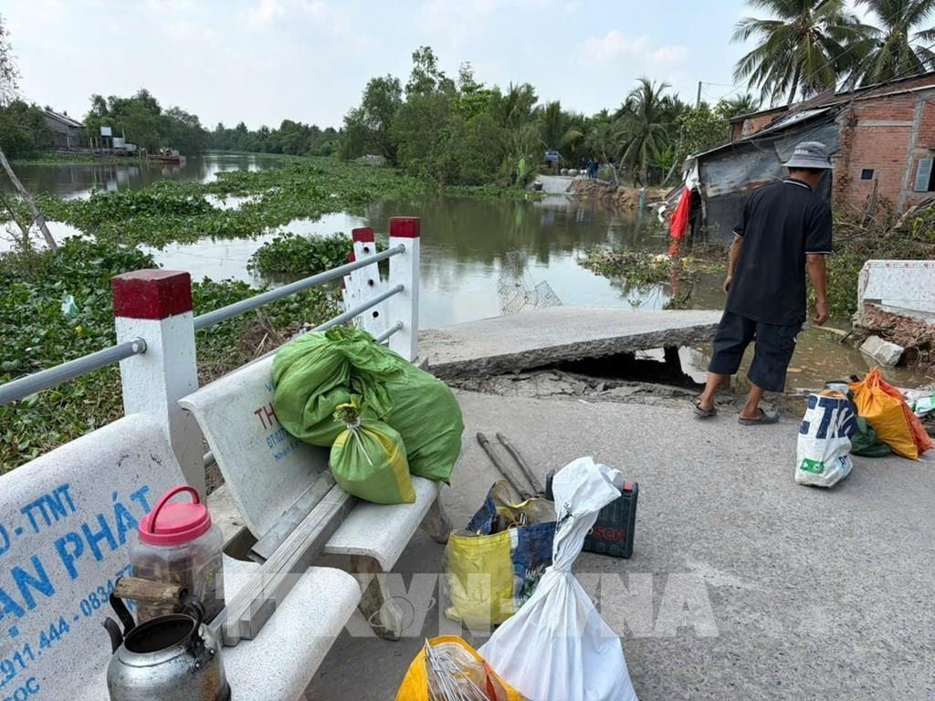 Hiện trường vụ sạt lở nghiêm trọng đã xảy ra trên tuyến đường Đông sông Phú An, thuộc xã Bình Phú, tỉnh Đồng Tháp. Ảnh: Công Trí-TTXVN
