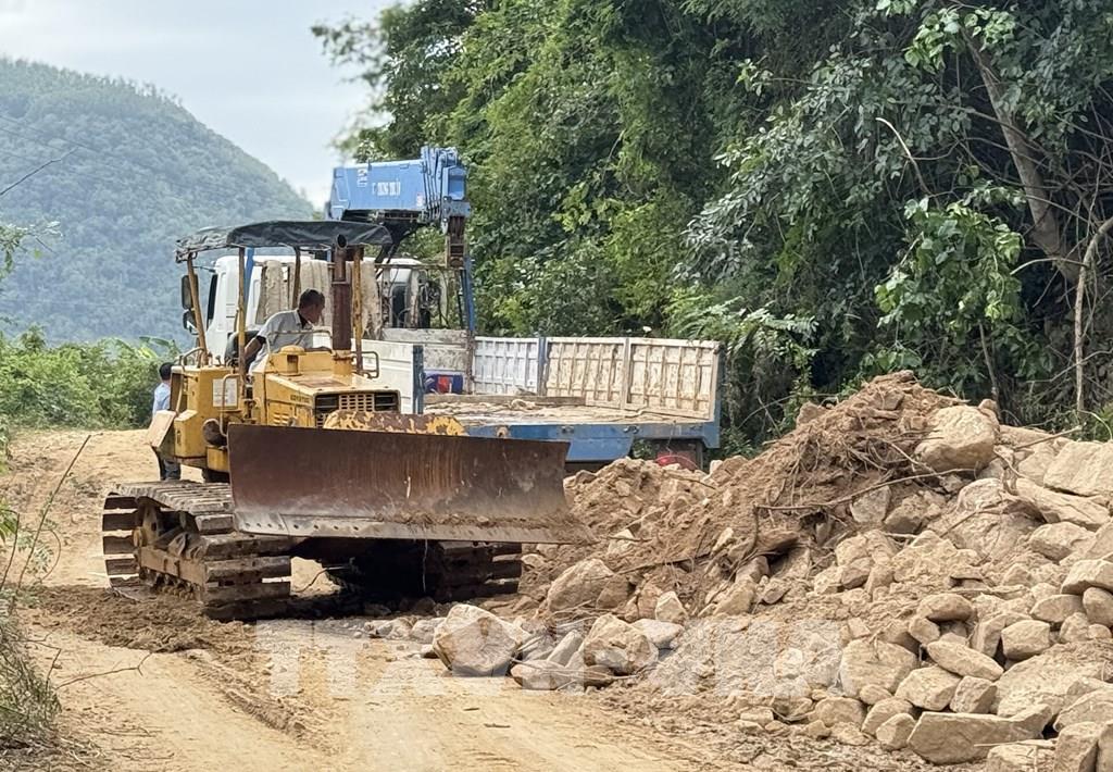 Các đơn vị thi công nỗ lực sửa chữa tuyến đường dẫn vào thôn Phú Hải, Phú Đồng. Ảnh: Tường Quân - TTXVN