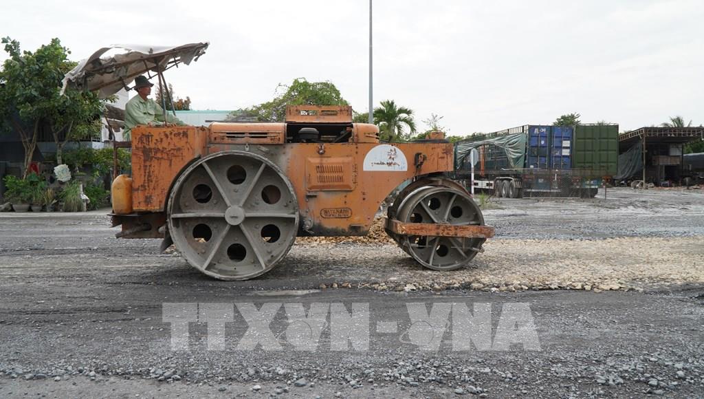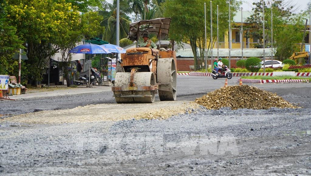 Đơn vị chức năng khắc phục tình trạng xuống cấp trên đường ĐT.852B, đoạn thuộc xã Tân Dương, tỉnh Đồng Tháp. Ảnh: Nhựt An - TTXVN