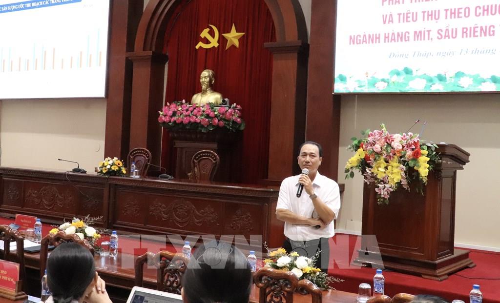 Ông Võ Tấn Lợi, Chủ tịch Hiệp hội sầu riêng Đồng Tháp phát biểu. Ảnh: Hồng Nhung - TTXVN