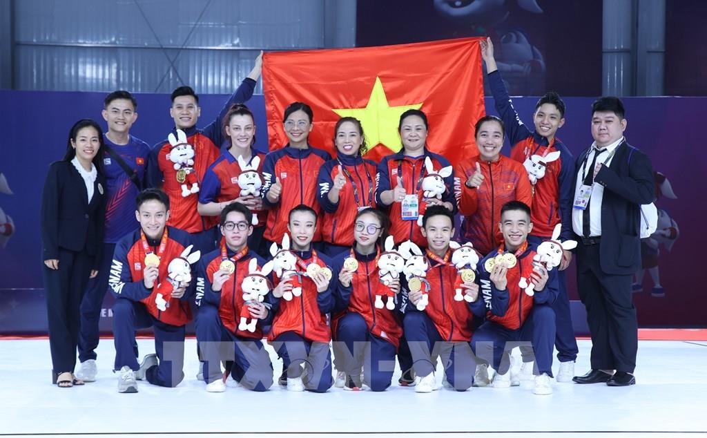 Đội tuyển Aerobic Việt Nam xuất sắc giành vị trí nhất toàn đoàn khi giành trọn bộ cả 5 HCV. Ảnh: Hoàng Linh-TTXVN