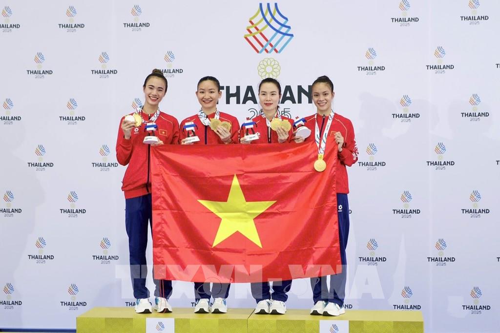 Các VĐV Hoàng Thị Mỹ Tâm, Đinh Thị Hương, Nguyễn Thị Diệu Ly và Nguyễn Thị Thu thi đấu xuất sắc, đánh bại chủ nhà Thái Lan 2-0, giành HCV. Ảnh: TTXVN