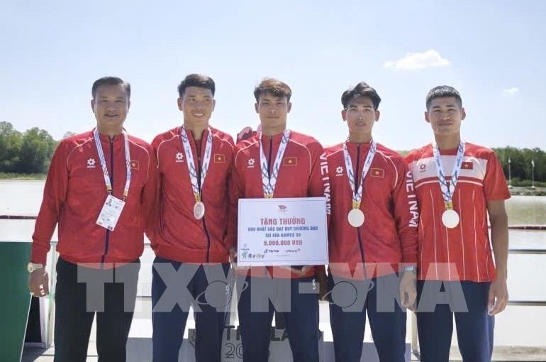 Lãnh đạo đoàn Thể thao Việt Nam trao thưởng, động viên các VĐV Triệu Hoàng Long, Bùi Văn Hoàn, Nguyễn Văn Hà, Nguyễn Hữu Thành giành HCB Thuyền bốn Nam hạng nhẹ Ảnh: TTXVN phát