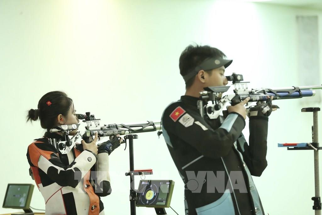 Mộng Tuyền và Tâm Quang thi đấu xuất sắc, mang về tấm HCV đầu tiên cho bắn súng Việt Nam. Ảnh: TTXVN phát