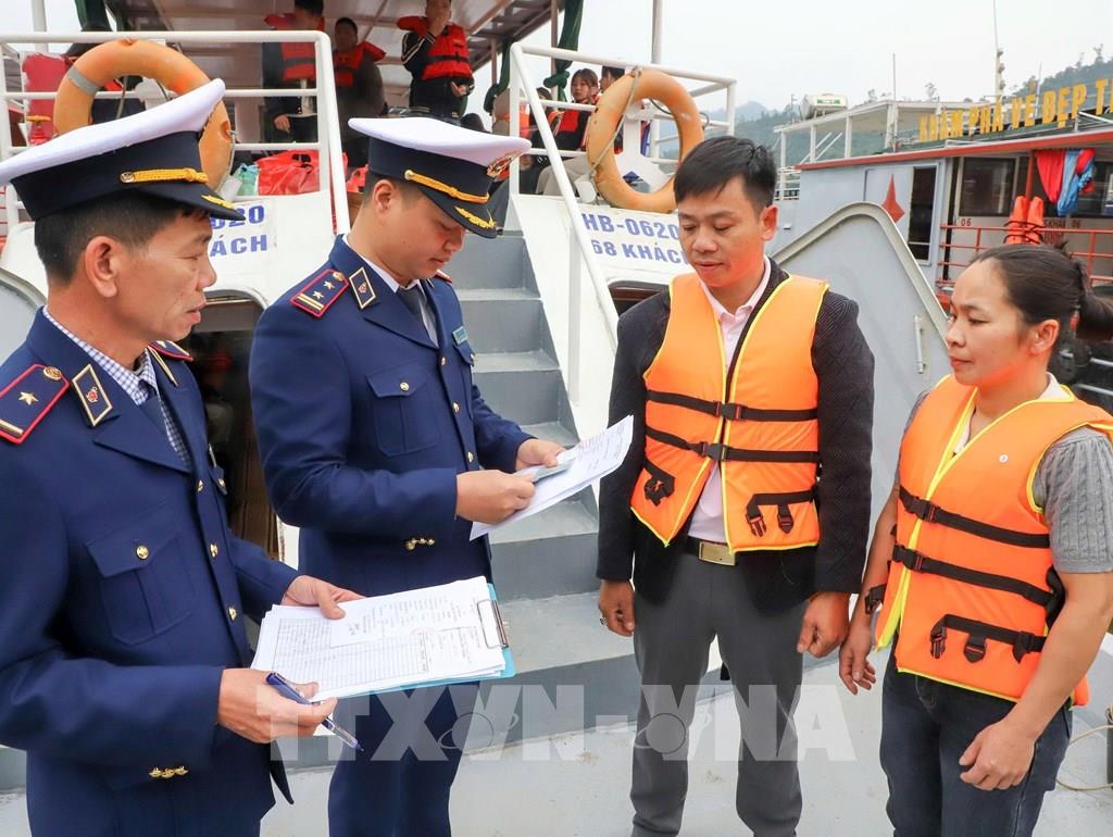 Lực lượng chức năng tăng cường kiểm tra các phương tiện giao thông đường thủy nội địa khu vực lòng hồ sông Đà. Ảnh: Đại Lâm - TTXVN