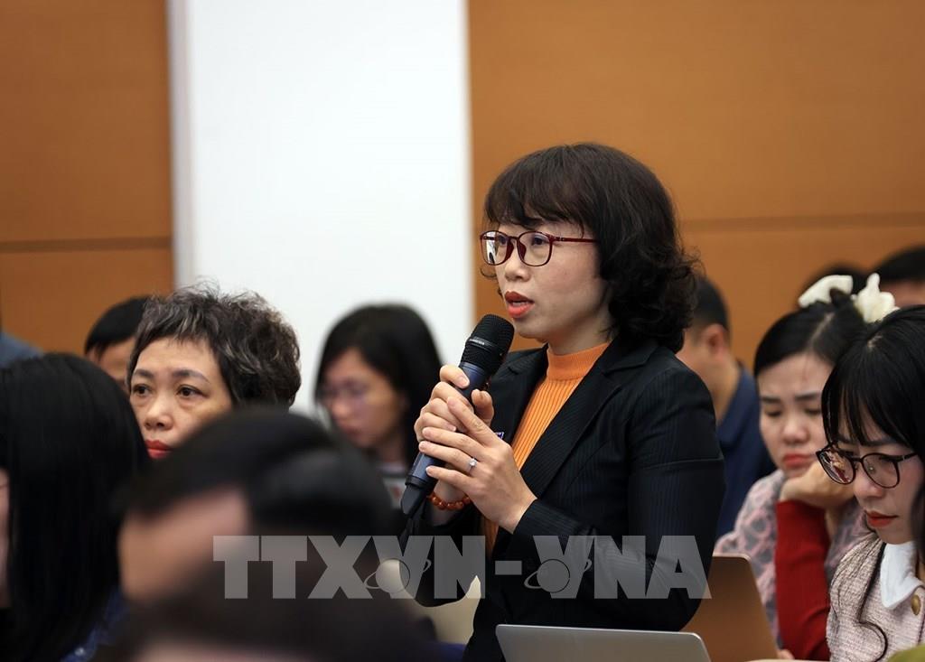 Phóng viên Thanh Vân của Thông tấn xã Việt Nam đặt câu hỏi tại buổi họp báo. Ảnh: Tuấn Anh - TTXVN