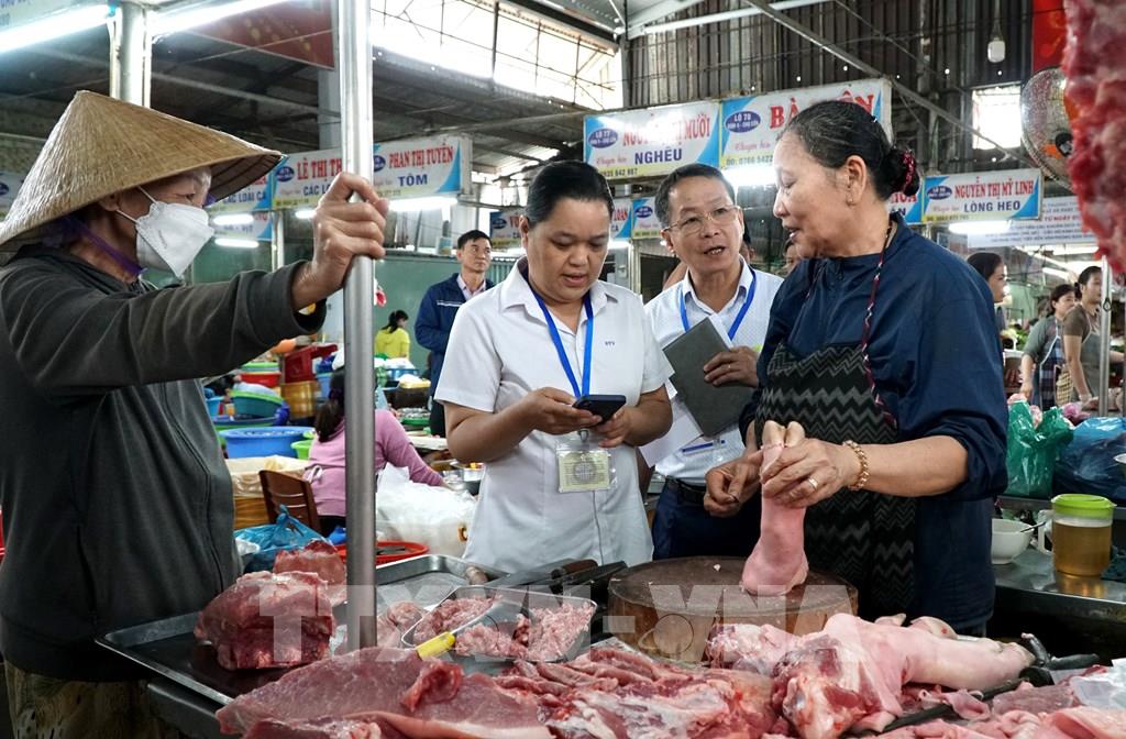 Đoàn kiểm tra, thu thập thông tin của Thống kê thành phố Đà Nẵng khảo sát giá thịt lợn tại Chợ Cồn (phường Hòa Cường, thành phố Đà Nẵng). Ảnh: Quốc Dũng - TTXVN