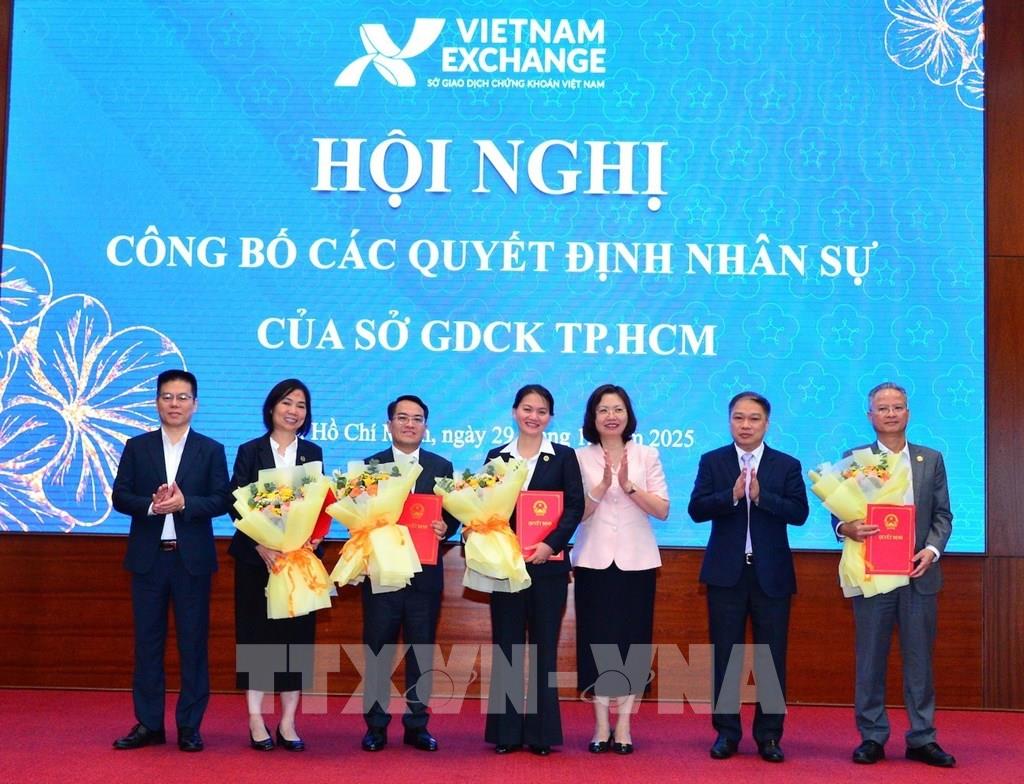 Lãnh đạo Uỷ ban Chứng khoán Nhà nước trao các quyết định nhân sự tại HoSE. Ảnh: TTXVN phát