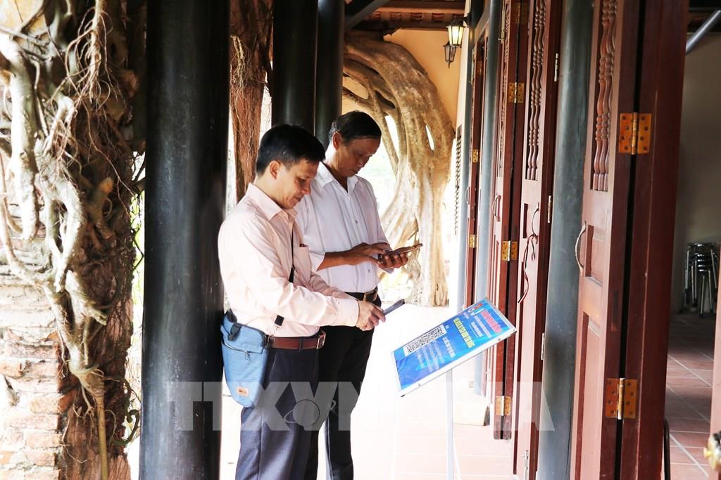Du khách quét mã QR để tìm hiểu thông tin tại Di tích lịch sử - văn hóa cấp tỉnh đình Tân Đông (Đồng Tháp). Ảnh: Hữu Chí - TTXVN
