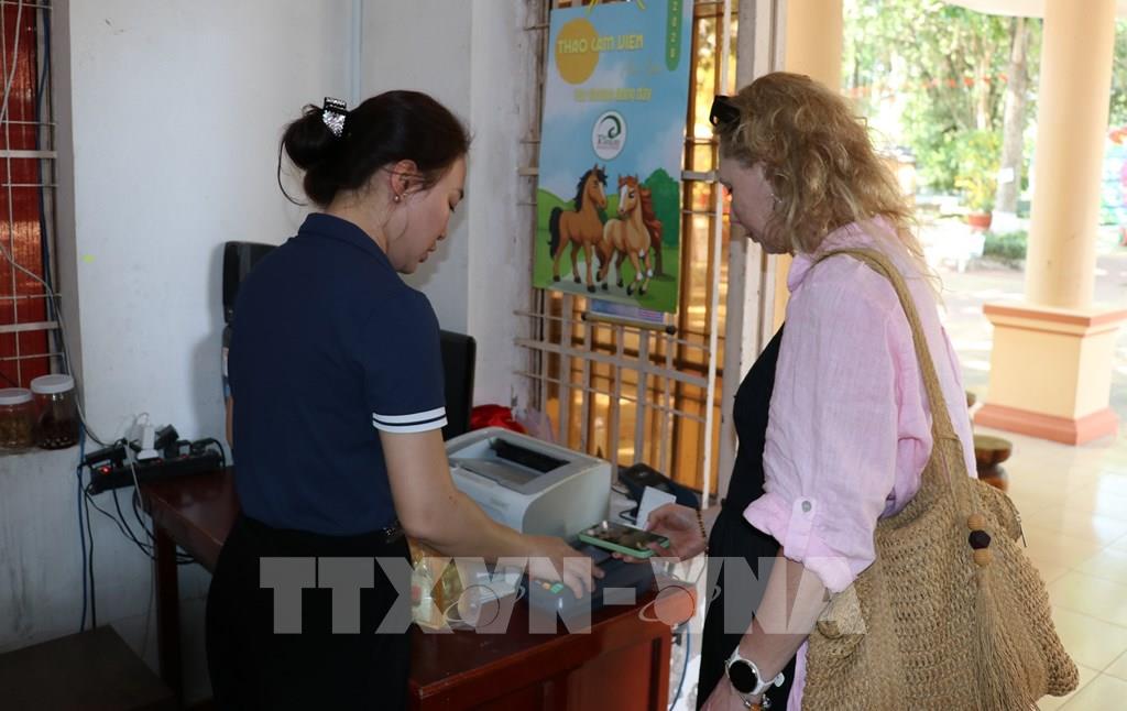 Khách nước ngoài quét mã QR thanh toán tại điểm du lịch tiêu biểu Trung tâm Nuôi trồng Nghiên cứu Chế biến Dược liệu Cục hậu cần Quân khu 9 (Trại rắn Đồng Tâm), ở xã Kim Sơn, tỉnh Đồng Tháp. Ảnh: Hữu Chí - TTXVN